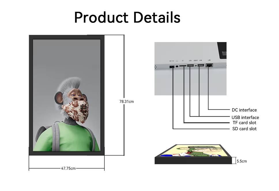 3. Дизійна конструкція: ультратонкий РК-оболонка рекламної машини із загартованим захистом від скла, так що РК-екран не пошкоджений,